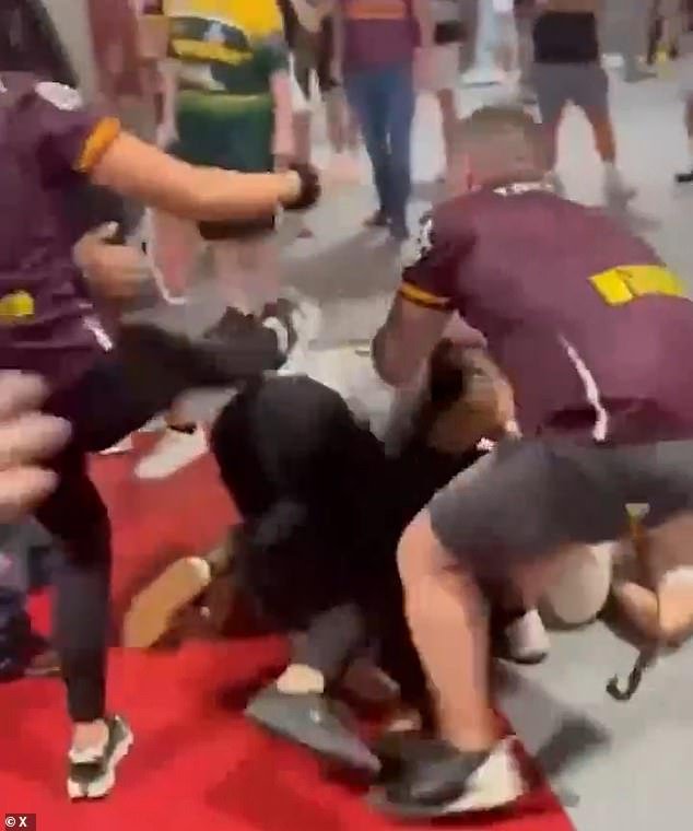 Video circulating after the Panthers’ shutout shows three men engaged in a violent altercation in the stadium concourse, with a female Broncos supporter joining in and kicking a Panthers fan. Separate smaller fights broke out nearby, while one man desperately tried to intervene, heard yelling “Stop, stop, enough, enough.”