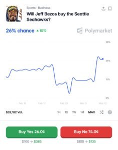 On Polymarket, the world’s largest prediction market, Bezos currently leads the field at 27% in the race to buy the Seahawks, with John Stanton as the next closest at 16%. In a field packed with billionaires, the Amazon founder stands alone at the top.